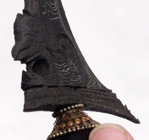 Not so clear, what figure it is. Maybe Garuda-headed naga. The pamor in the naga's body, is "pamor tambal" (I don't know the right English word for it). There are no more traces of gold kinatah or tinatah left... Is there any info on this motive? (I will make it clearer, soon)
