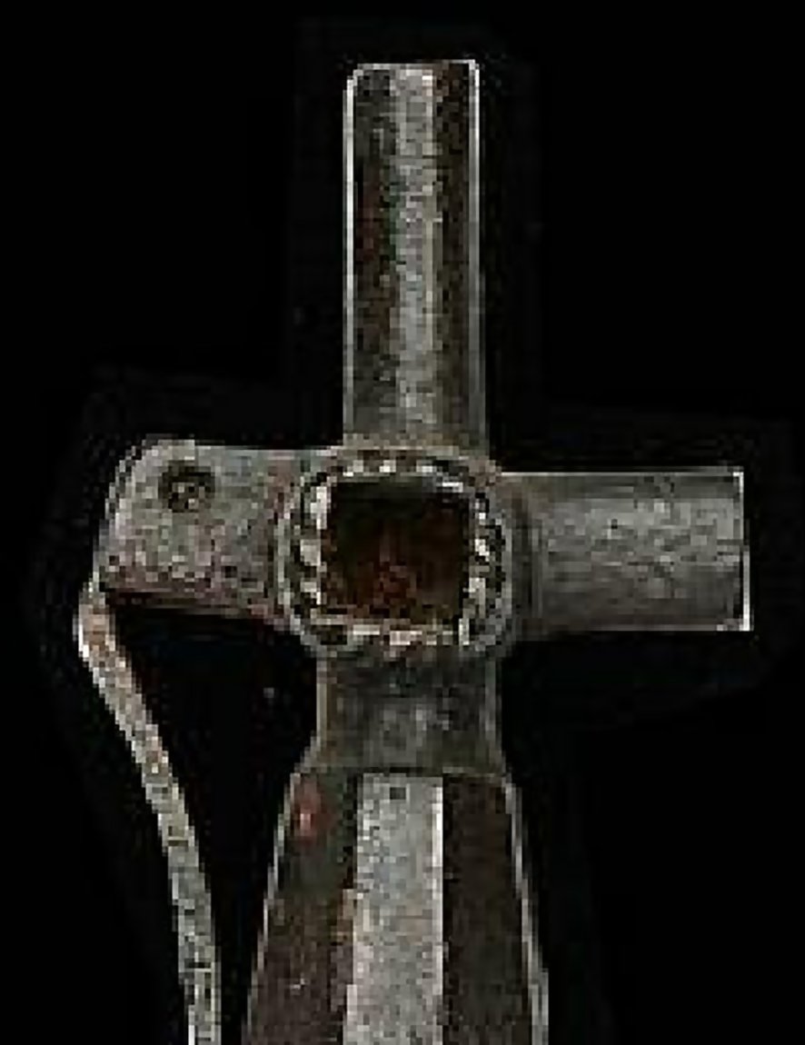 This plain but 'untouched' all-iron combined powder horn and swiveling wheellock spanner, probably Austria or South Tyrol, ca. 1550-60, was sold as a lot together with a little brass flask at Bonhams London, 23 July 2008, for 500 GBP.