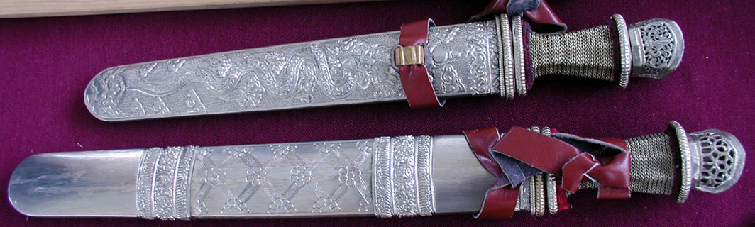 On average, the weapons with the sheet metal pommels are probably more recent than the pierced ones, although the types obviously overlap. Writing in 1910, J. Claude White, a British diplomat in Sikkim and Bhutan, characterized the pierced work, as on the traditional pommels, as almost a lost art. The pierced pommels were much more expensive. (So what did a poor man do if he couldn't afford a pierced iron or silver pommel? Probably had a bare horn or wood hilt on a working blade.) |