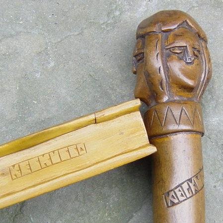 Just wanted to add this as it is quite interesting. It could also be a question, are these phallic stick clubs/batons possibly an Ethiopian tradition? I was hoping to include an ebay picture of the same three head motif on another stick only the size of a walking stick or staff but sadly I must have deleted it by mistake when clearing watched items. Here is a box, a suspect a snuff box judging by the black powder remains inside, carved as a bible. Look at the carved letters. The stick has one less but I think they are meant to be the same word. They are carved in the same manner but not by the same hand or in the same time. A coincidence the carvers having the same name? The name of a place of origin? I do not know but just goes to show one has to look far and wide for clues.