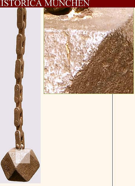 It was made from the grip and writhen pommel of a two hand sword, ca. 1525-30, retaining its original leather covering over a cord binding, the twisted iron part retaining an old minium (red lead) paint, the chain acting either vertically or horizontally only, just like the chain on a bicycle or wheel-lock, and the head consisting of a polygonal sword pommel of ca. 1400.