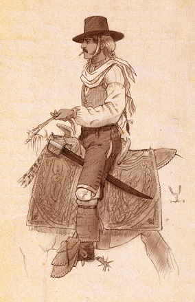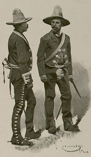 As always it is hard to figure any sort of developmental progression in these often rural and unregulated contexts Local blacksmiths and armorers were most innovative and certainly duplicated these weapon features favored by the incoming men from other colonial regions. These notable guard rings appear to have become a component in examples of the espada ancha which are typically regarded as consistently situated in Mexico's frontera (northern frontier regions) northern Mexico and Spanish southwest. There the espada anchas, which were actually short heavy hangers or 'cutlasses' eventually evolved into longer swords, which in the Mexican tradition were typically saddle mounted. Characteristically, caballeros and vaqueros mounted sword scabbards to the mochilla under the saddle and left leg of rider. A vaquero with espada ancha worn on saddle as seen c. 1820s(first image). By 1850s, these had become shorter and more like Bowie knives so worn on the person. By later in the century saddle swords were still more the standard, so indeed there were cases of Mexican saddle mounted types into the Revolution period. However the Mexican 'rurales' of Diaz and many 'chinacos' into the Revolution wore swords in scabbard in the traditional manner. In the photos.....a vaquero of 1820s (original art by David Rickman for my article on espada anchas, 2023) the espada ancha is drawn from the 2nd from bottom in my grouping. Espada anchas.....third from bottom with horn grip has dragoon sword blade and may have been saddle mounted, probably from Sinaloa. Rurales, frontier police of Porfiriato c. 1880s Emiliano Zapata, leader of Mexican Revolution forces in south, Morelos. Typical 'rurales' saber c. 1880s. Last edited by Jim McDougall; Yesterday at 02:40 AM. |