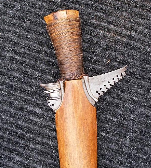 The second blade is mid 20thC & a lot of those blades were made with recycled steel, this one had a lot of deep rust, leaving the major pits. The scabbard once had MOP or turtle shell, now missing. |