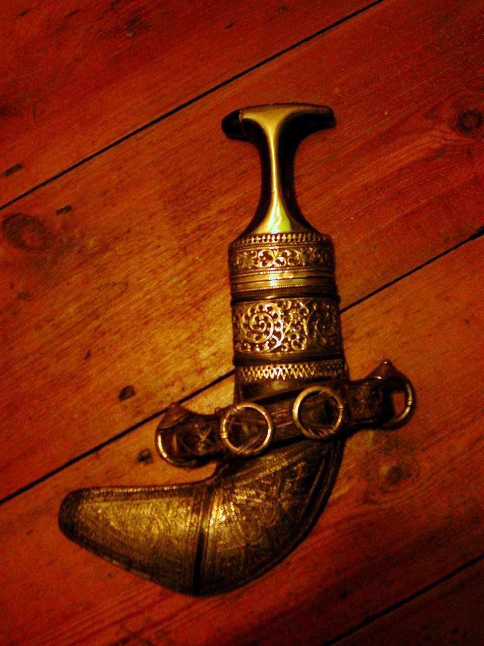 Salaams Richard G and welcome to the Forum !! This is an excellent subject in which to begin your observations. The Khanjar you post is typical in all respects of Omani work. The decorative technique is in essence the famous "Arabesque" style copied and modified across the entire region. Richardson and Dorr in their book "The Craft Herritage of Oman" go to some lengths to explain the techniques of Khanjar decoration. Perhaps best summed up; Quote. "Arabesque patterns in spirals are used for the ornamentation of silver chapes and bands for sword and khanjar scabbards and hilts ~ a style commonly referred to as being "shamaliyyah" ~ of the north".Unquote. The pattern appears on trays and dishes (and on most Islamic decorative objects including tiles, ceramics, carpets and even on henna hand decoration) either worked on by hand or stamped or spun onto the plate from a dye or pattern cutter... spinning was a method of placing a cyclic pattern onto a plate often detected by a centre- plate-dent where the spinning object has been steadied in the rudimentary lathe. Nizwa is a traditional centre for copper wares as well as agricultural tools and silver and gold work. The tray however is purely Indian with many regions where copper and brass were decorated. Omani trays tend to be quite austere; decorated in geometric bands and Arabesques..whereas Indian work may well have those plus fabulous animals depicted in leafy scrolled borders. The following techniques are employed in Omani Khanjar making where the craftsmen encompass the work of steel, silver, wood, horn, leather and emboidery skills ~ casting, forging, sheet wire and inlay, filigree, chasing, engraving, stamping, doming, granulation, gilding and burnishing. This was a male dominated skill except that women were involved doing "tatriz" the silver emboidery however today there are apprenticeship schemes with females involved at all stages in this great traditional work. Regards, Ibrahiim al Balooshi. Note; Architectural masterpieces in "arabesque" can be seen on the ceilings at Jabrin Palace and Bait al Falaj as well as on the Muscat Merchants houses. The same decorative technique derived from rows of overlapping circles which intersect at their midpoint on an overlapping grid is used on wood carvings on dhows and handcarved doors and windows. The technique goes back in essence to the allowable respected Islamic geometric art form and is a classic in Oman. Favourite silver items decorated thus are the Khanjar, Sword, Hirz silver pendant box and the belt buckle. After Note ~ Please note that the crown appears to be missing (from the toe of the scabbard) on your otherwise nice example of an Omani Khanjar. Last edited by Ibrahiim al Balooshi; 22nd January 2012 at 05:59 PM. |