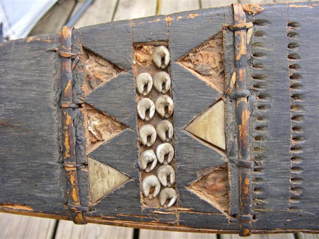 I never would have the money to buy a kanta shield from Sulawesi in good condition which will cost some thousand $$ since this shields are very rare. By searching through ebay I found some days ago such a shield wrong labeled and in a category where I normally don't search. The shield is in a sad condition but restorable, see pictures from the seller. Most of the hair and nearly all bone plate inlays are missing. The inlays by this shields are from bone and not from MOP. The small shells are nassa shells. The shield is 44" (112 cm) long and 5 1/4" (13 cm) broad.