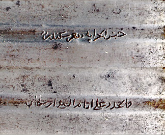 Yes, the sword bears an inscription, placed upon both sides of the forte, referring to Sayf al-Din Aristay, thus placing its accession into the arsenal within the first decade of the 15th century. The flats of the tang are not visible as wooden grips were riveted on, presumably at the time when these swords were mounted in panoplies in the Ottoman trophy hall at St. Irene. |