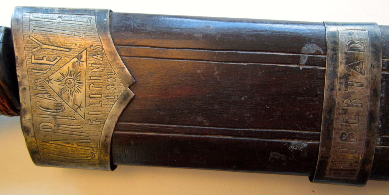 SPUNGER THE EXAMPLE YOU SHOW WITH THE INLAYED BLADE IS SIMULAR TO THE ONE I SHOW IN MY POST ABOVE WITH 12 ITEMS IT IS PICTURE #7 AND HAS AN OPENWORK CARVED SCABBARD WITH SILVER BAND AS WELL AS A INLAYED BLADE. SORRY THE PICTURE IS SO BAD BUT IT IS ALL I HAVE. I AGREE IT WAS LIKELY MADE BY THE SAME ONES MAKING THE FANCY BOLOS ON LUSON VERY LIKELY DURING THE SPANISH OCCUPATION PERIOD. THE UNBRELLA HOOK GARAB WAS MADE THAT WAY AND NOT RECARVED FROM A BROKEN HANDLE. I HAVE NO IDEA OF ITS ORIGIN OTHER THAN PHILIPPINES.