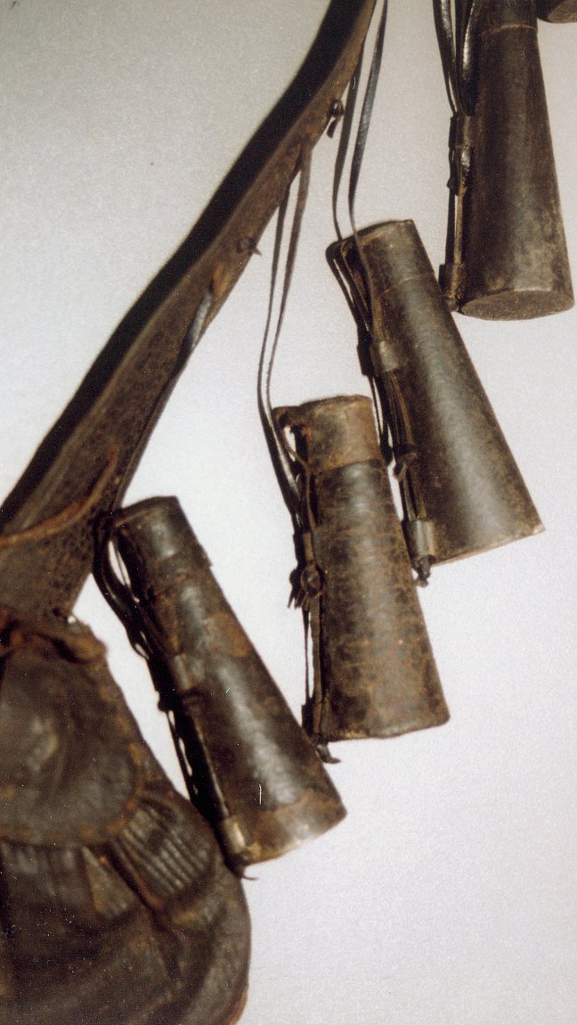 A very spacious but delicate leather pouch on an arquebusier's bandelier of Swiss type, 1st half to mid-16th century, in the Germanisches Nationalmuseum (NM) Nuremberg; the small powder measures are of tinned iron. This enormous pouch certainly not only answered the purpose of holding balls but had other small accouterments as well: e.g. for wadding and cleaning tools like scourers etc. that were screwed to the threaded finial of the ramrod.