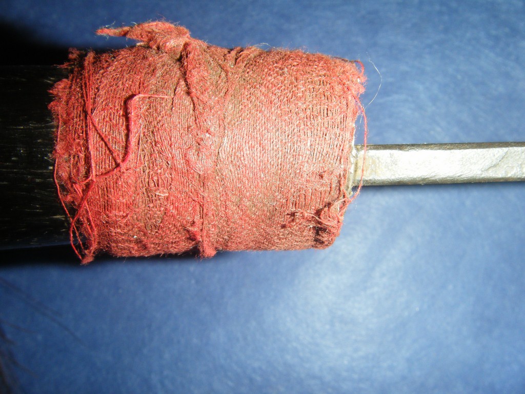 I still have a Rugi/Har which I get once from my friend who is a "orang" Alor. He told me that this sword is from his father. This sword has a wooden hilt with iron ferrule (hidden by the red cloth), the carving is also a little bit crude, blade isn't laminated and the goats hair was replaced some years ago by the owner. He coming from the South of Alor, village Musape. The sword is 63,5 cm long, no scabbard. Blade is 4,4 mm thick at the base.