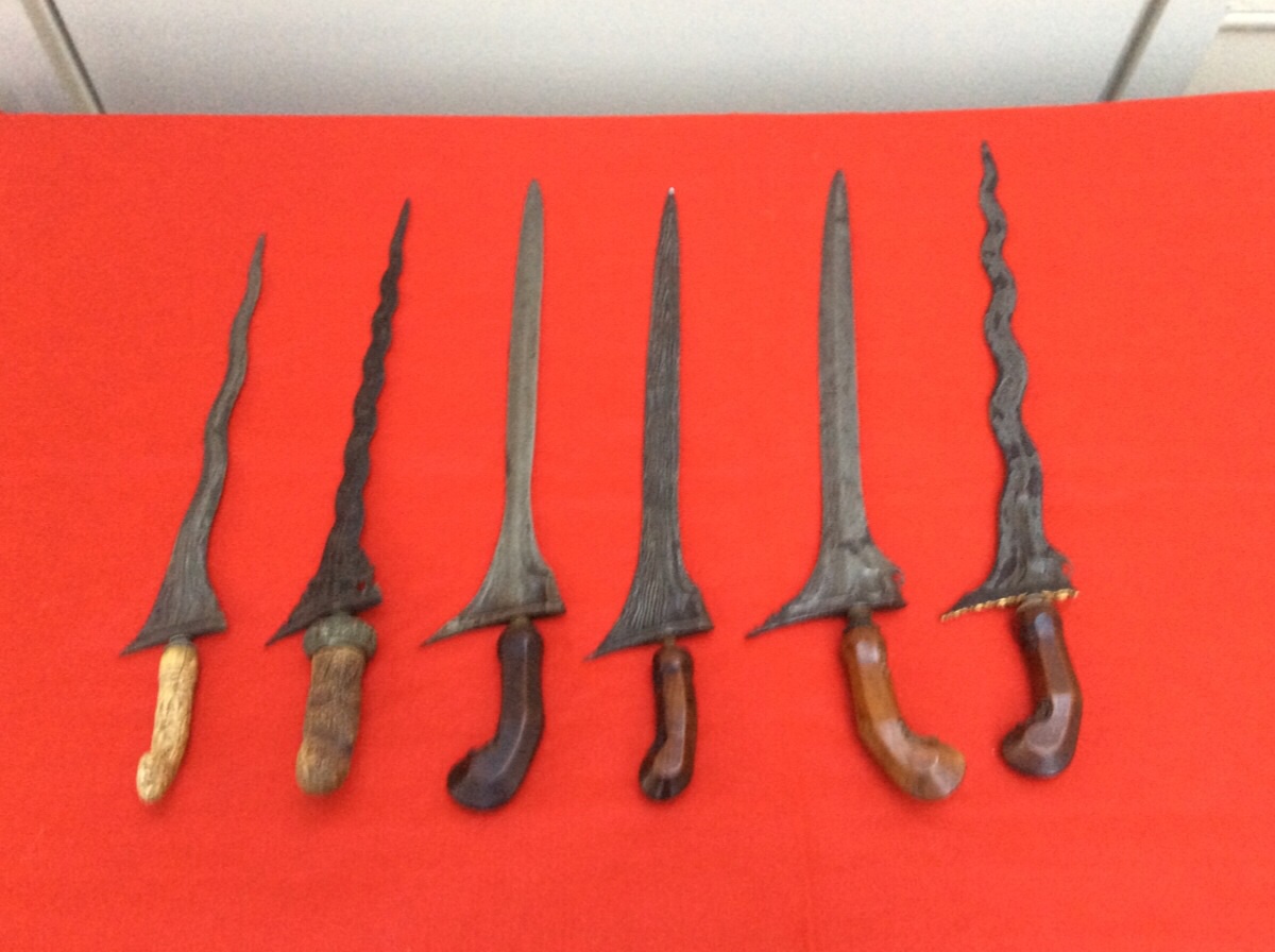 It has been a little quiet on the forum so thought I would start a thread about the variety found in Javan blades. I'm sure near endless but I have 6 examples to share for comment/feedback. I'm curious how everyone would date these from oldest to youngest and what the potential range would be. I understand difficult to do absolutely from pictures so guesses are fine in this scenario. So will number the keris from left to right 1-6. I will start with an overall shot of the group and then a separate posting to show a few more details of each one.