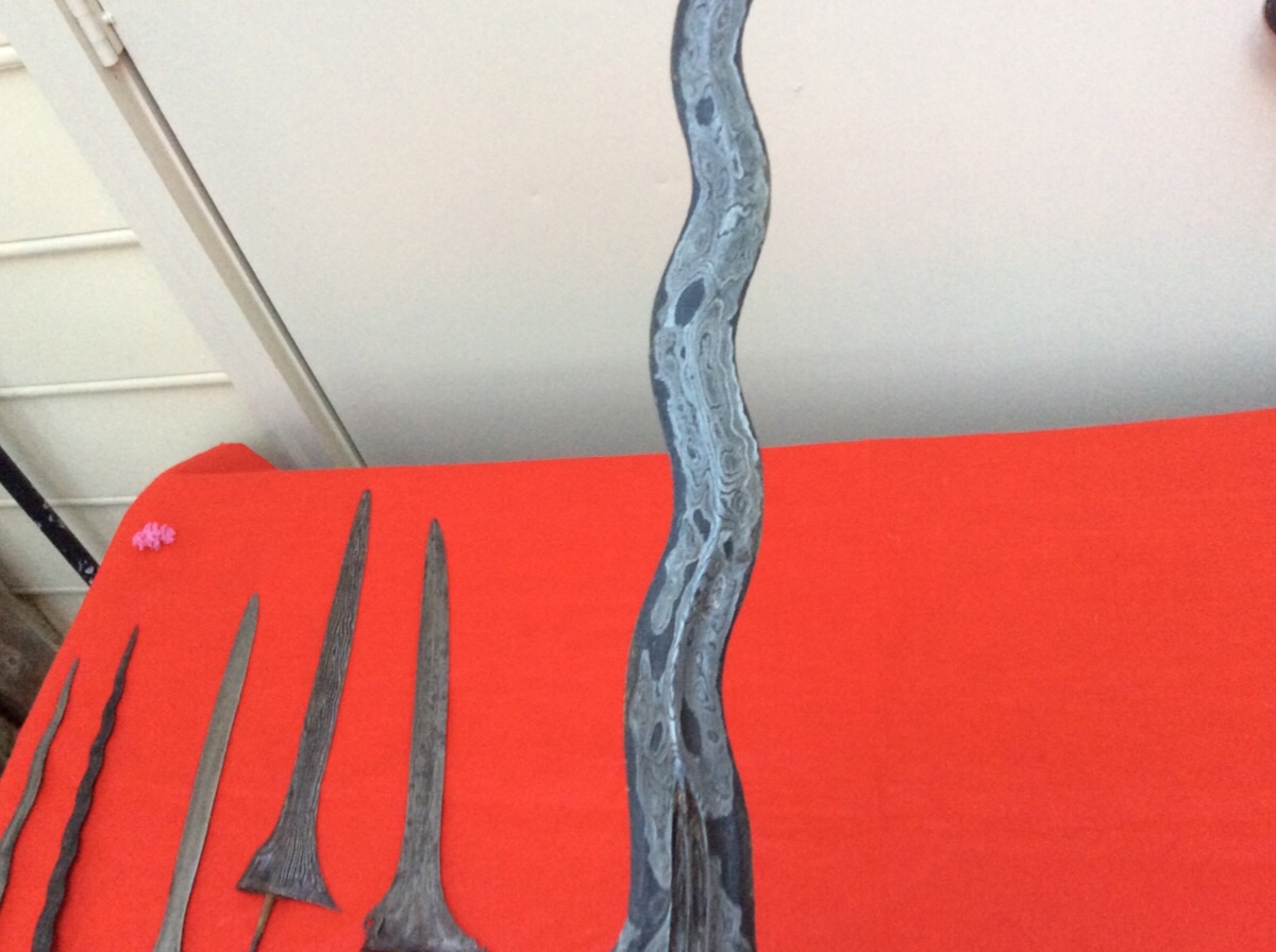 Example #3. Unusual blade in that it is narrow at the hilt and widens towards the center. No visible pamor but some lamination lines visible.