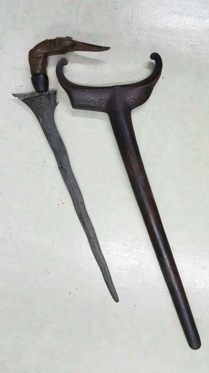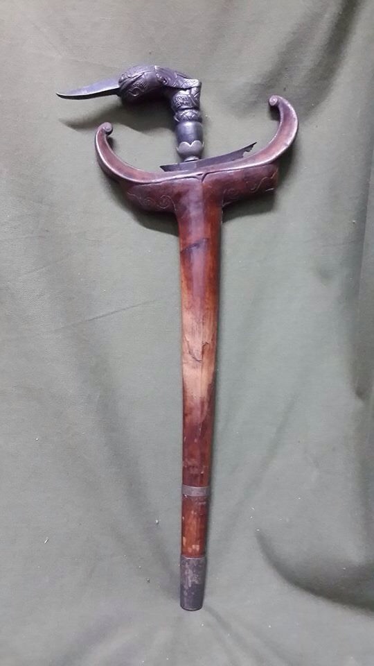 I have a piece in my collection which has baffled me for a while. It has features of a tajong, like elaborate crown, beard, and a more abstract anthropomorphic form. But instead of a regular tajong sheath, it was affixed to a coteng style sheath which was larger than usual. The blade is what my group of collectors here in Sg refer to as "Chenok" style, after the place the form is said to originate from.
