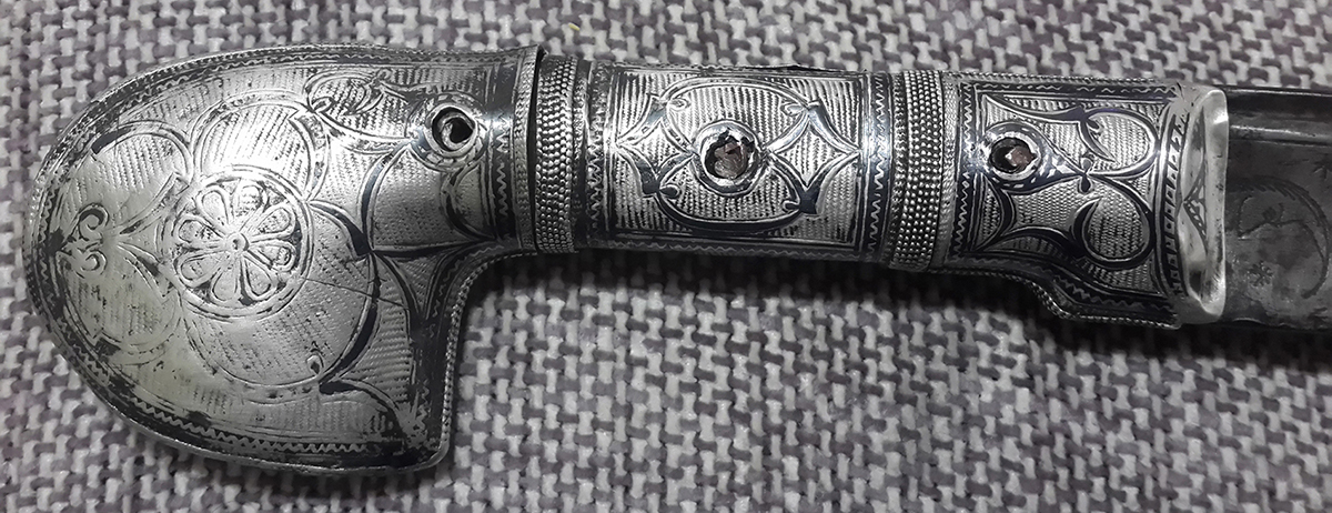 Here goes the European blade first. I thought it would be better if I added a drawing of the figures, to have a better idea, for the origin or a more precise dating. I also add a photo of one of the silver fittings on the belt, possibly old Circassian style.