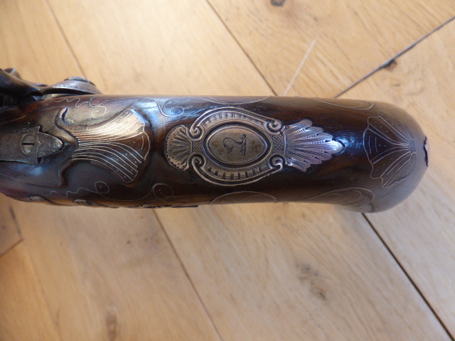 For those suffering withdrawal symptoms after enjoying Corrado's collection here is a pair by William Paris of Warwick, the grandson of the more famous Nicholas Paris. The pistols date to c.1740 and on each escutcheon is engraved the owner's crest - a long-necked bird (heron? but only the neck is displayed) with a small fish in its beak. If anyone can discover what family bore this crest I would be most interested to know.