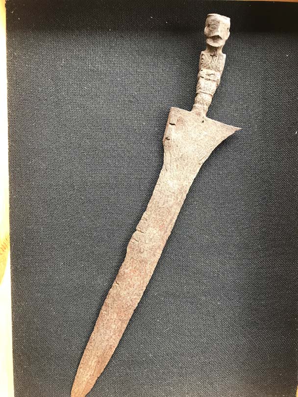 I regret I have been unable to make any constructive comments on the images you have posted, but I will add a couple of comments now. In respect of determination of age, there is a belief amongst some people who have looked closely at the keris sajen, that the head of the hilt figure may give an indication of age. Many hilt figures show some sort of head apparel, a hat, cap or something, the belief is that identification of the head-gear might point towards the period. The image of a figure with a European style hat tells its own story, and something very unusual about this figure is that the orientation of the blade is reversed. In the past some people have attempted to paint the keris sajen as a direct continuation of a Dongson knife that had a figural hilt, but to me this seems extremely unlikely as direct cultural links cannot be shown, and the gap between the Dongson era and the Javanese early Classical era is simply too great. The keris sajen reflects the form of the Modern keris, which means that the keris sajen did not develop as a cultural artifact until after the Modern Keris appeared, which the evidence seems to indicate as circa 14th century, and after the keris penetrated Javanese society as a whole and became endowed with talismanic qualities in its general form, and this seems not to have occurred until after the Islamization of Jawa. The complete argument against the extreme age of the keris sajen is very lengthy, and here is not the place for it. The image I have placed into this post that is from Kulino's earlier posting deserves special attention, because the hilt form is an echo of the Dongson form. Although this gives an appearance of age in the image posted, I do have very strong and very well grounded doubts about the true age of this example |