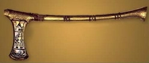 I know this is a long shot but here we have a 17/18thC Hungarian flail. The wooden haft is decorated, and it has an interesting clip attached. Vague similarities with the “pirate’s axe.”