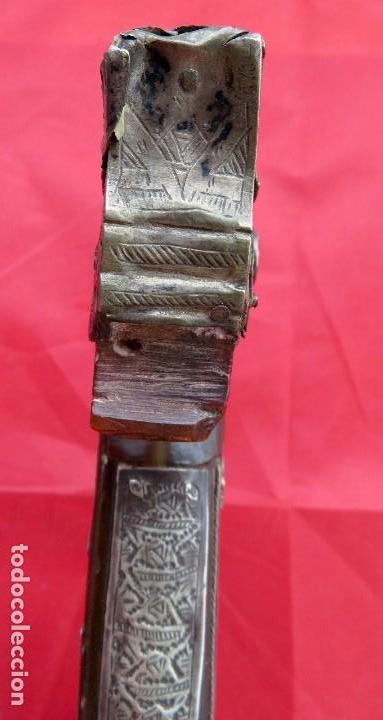 Absolutely gorgeous! However, I do not think it is North African. IMHO, it is South Arabian, likely Omani. My main point is the configuration of the blade: widening toward the tip. Similar configuration is seen in Elgood’s book on weapons of Arabia ( Fig. 2.1 and by description 2.2). Seems to me it is quite short: thus a genuine “nimcha”:-), a naval cutlass, so popular with seafaring Omanis. Also, the lavish decoration is very reminiscent of the luxurious Zanzibari nimchas with gold coins on the handle from Buttin’s catalogue ( plate XXX) and Hales’ catalogue ( Figs. 589-90). Similarly “segmented” decor of the scabbard is also seen in the same book ( 2.18 and2.21) Also, you might recall Elgood’s comment about Bukharans in Oman. They brought enameling there. I doubt there is an iron-clad provenance, so that’s only my gut feeling. Last edited by ariel; 24th April 2019 at 07:07 AM. |