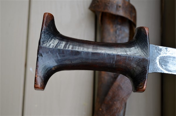 Oh, and as to how these handle: they are pretty front heavy (the grip is of course quite light) and they both feel to me with my limited experience a lot like draw cutting swords like tulwars and shamshirs, as if they want to be pulled around or along the body from the shoulder and elbow in a long slicing motion, if that makes sense. My guess is you wouldn't really do a western saber style moulinet with it (at least not with the shotel). The pommel reinforces that impression. But I could be wrong of course, as I don't know much about HAMA. The point on the shotel is a little terrifying to me when I carefully swing it around