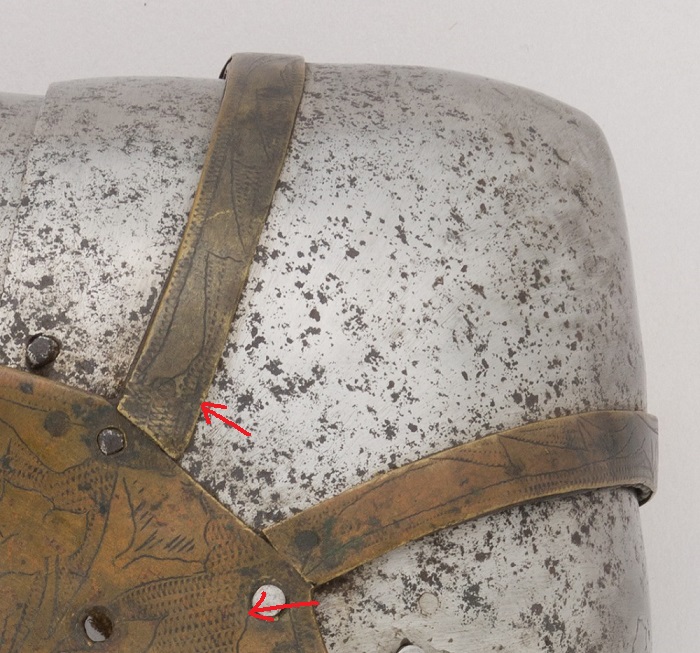 The pattern and shape of the copper alloy application is very similar to some extant examples dated to the same decades:
