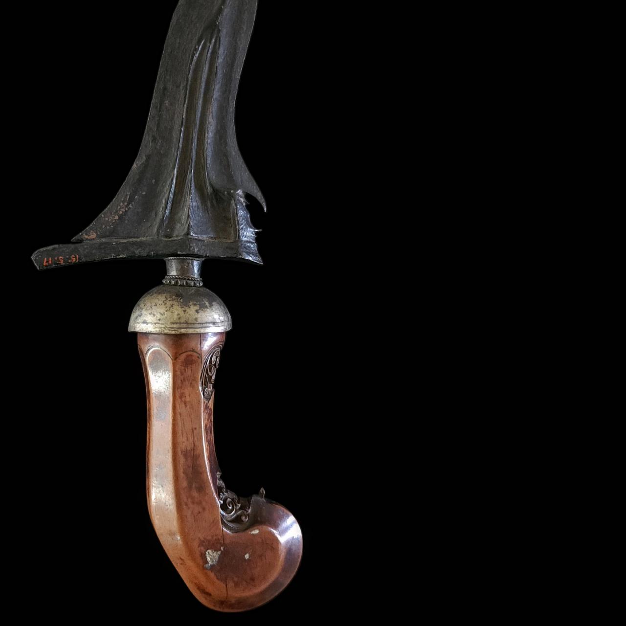 What I do know…this keris was deaccessioned from the Valentine Museum in Richmond, Virginia. There is a red painted accession number on the ganja “15.5.17” presuming that it had entered the museum’s curation in 1915, so at least this old. There was no sheath included with it. The blade is wavy in form which I believe looks to be 9 luk. There is a nice pamor throughout, with some chips to the edges, especially near the point. Strong blade profile. The handle hardwood with 7 flat planar sides and with two carvings on the interior of the hilt. I have read that this type may be (Solo?) from Central Java or Surakarta and cecekan style and may have association with demon symbolism in the carvings? The mendaq and cuff are silver or silver alloy (Not tested). Dimensions: Blade: 14 ½” (36,3cm) Hilt & Balde: 18 ½” (47cm)