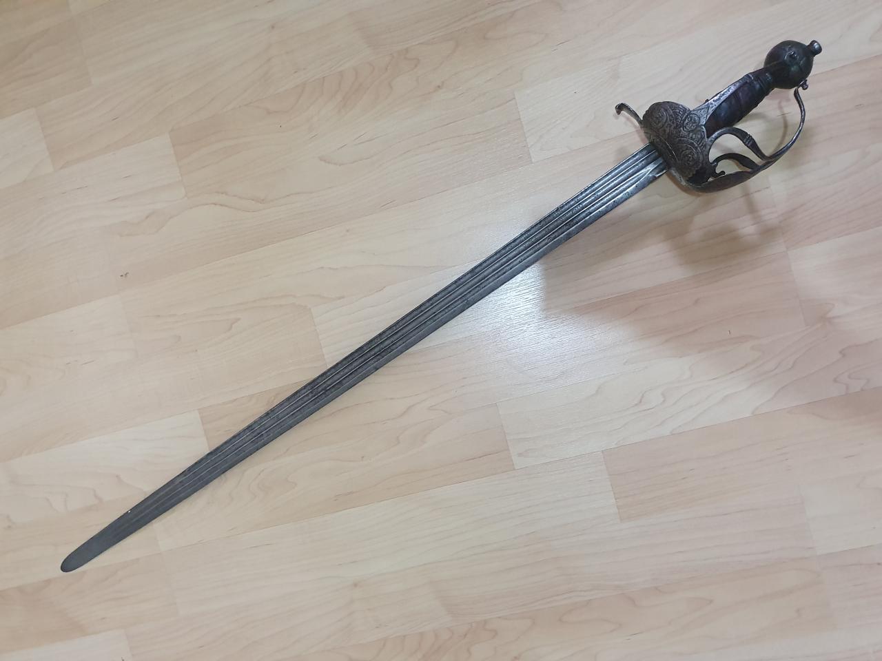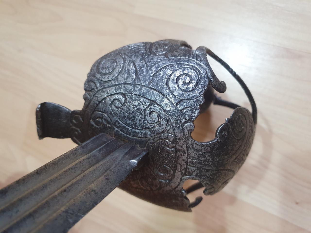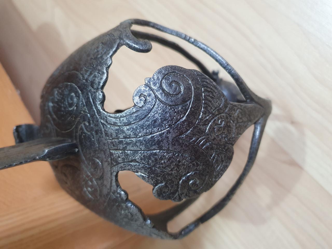 This is an extremely handsome example of these English half basket cavalry swords of early to mid 17th c. I honestly have not heard of the term proto-mortuary sword, as this goes in line with the death of Charles I of England who was executed in 1649 presuming the 'mortuary' hilt was commemorating that event. The term presumes the 'cavalier' style face typically in the motif of the hilt was the death mask of Charles I.