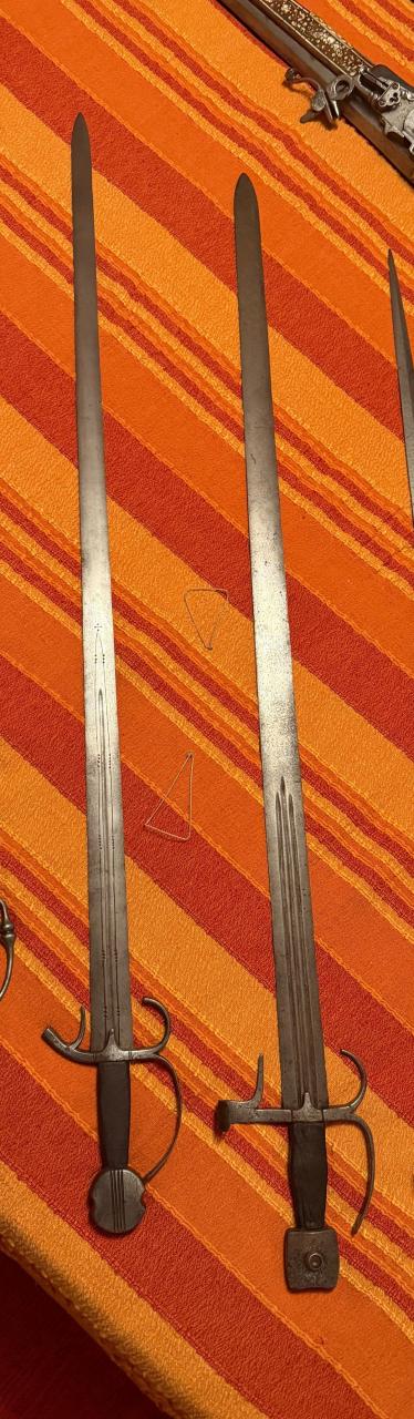 I think Mark Twain wrote that the only thing certain in life are death and taxes. Very hard to know for sure that swords are original. But you seem to do very well and catching on quickly. I’m just a history buff who likes to collect as a personal hobby, so I have no professional expertise from museum work. Those Venetian swords look good. I guess on the South Eastern side of the Adriatic they used almost any blades they could get their hands on. Schiavonas have all kinds of blades, not only Italian made. Sometimes the blades were changed. Sometimes the swords were used for generations and refurbished when needed. It’s hard to see properly but the grips seem refurbished? The blade on the left has decorations some say are like rosaries which are used to keep track of Roman Catholic prayers (Ave Maria, etc) so presumably the blades were predominantly used in Catholic countries like Spain and Italy. The blade on the right could be Italian with those fullers, but I read some posts that Kaskara blades in North Africa look quite similar. Maybe some of our members can exclude this possibility in this case. As always, not easy to see and judge from photos.