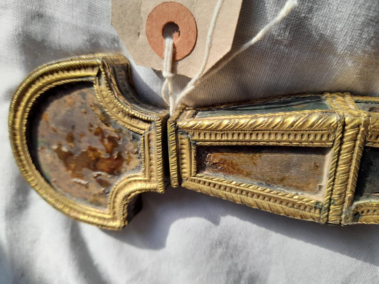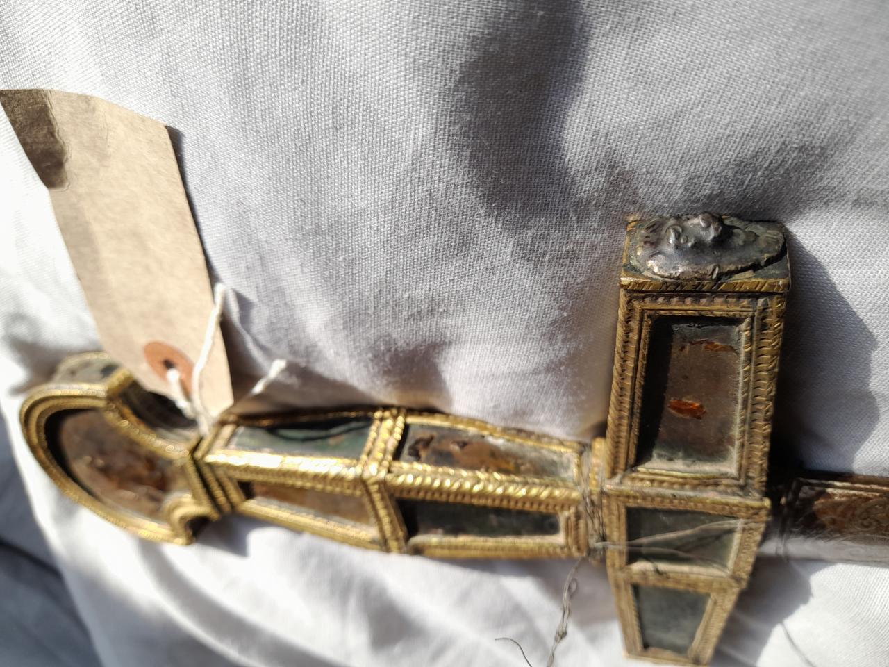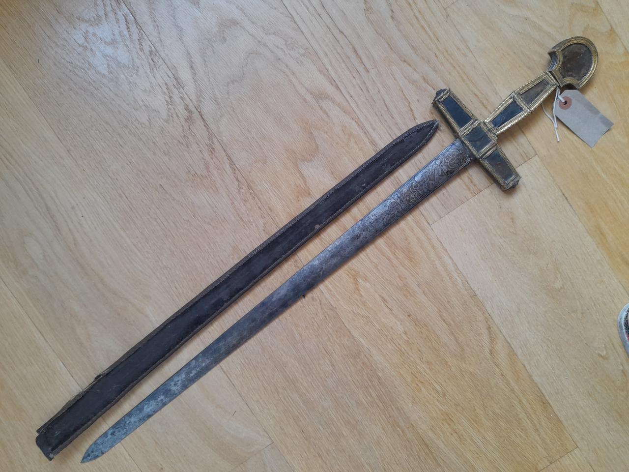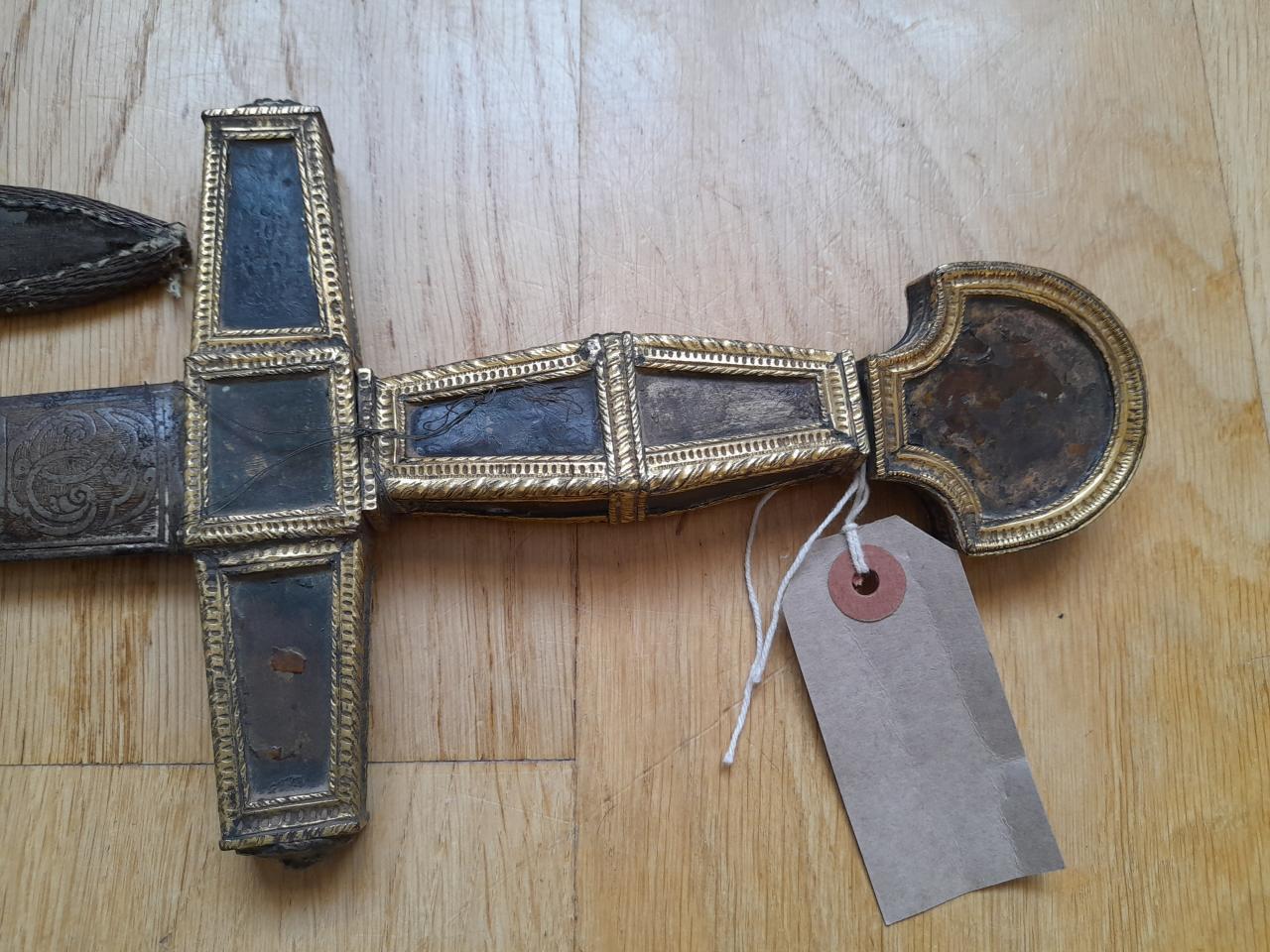 Looking for info on age and origin of this please. Gold mounts with missing details on hilt angels. Lenticular cross section springy steel sharp blade. Velvet scabbard. Thanks |