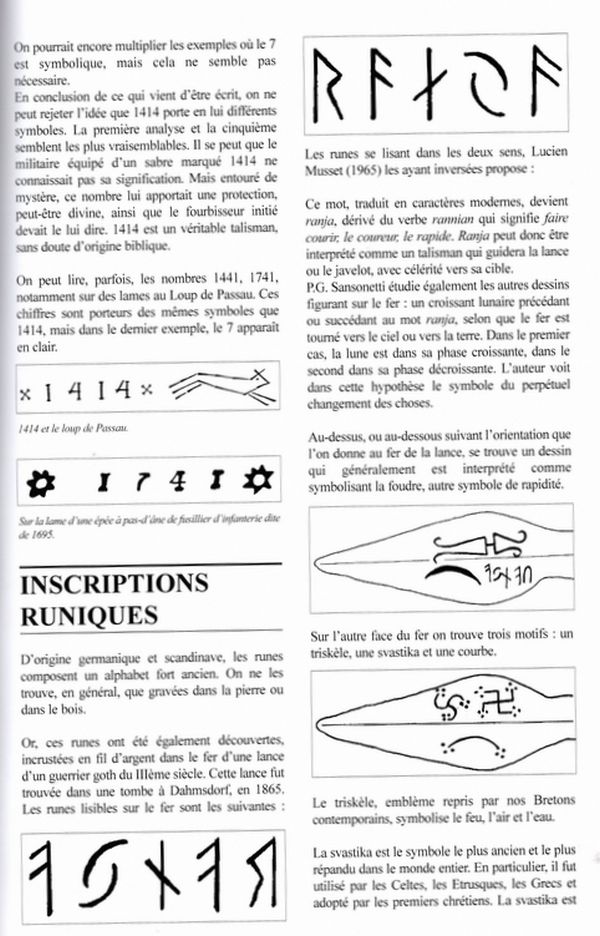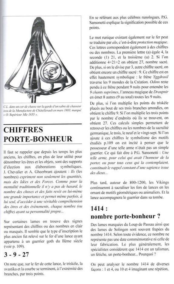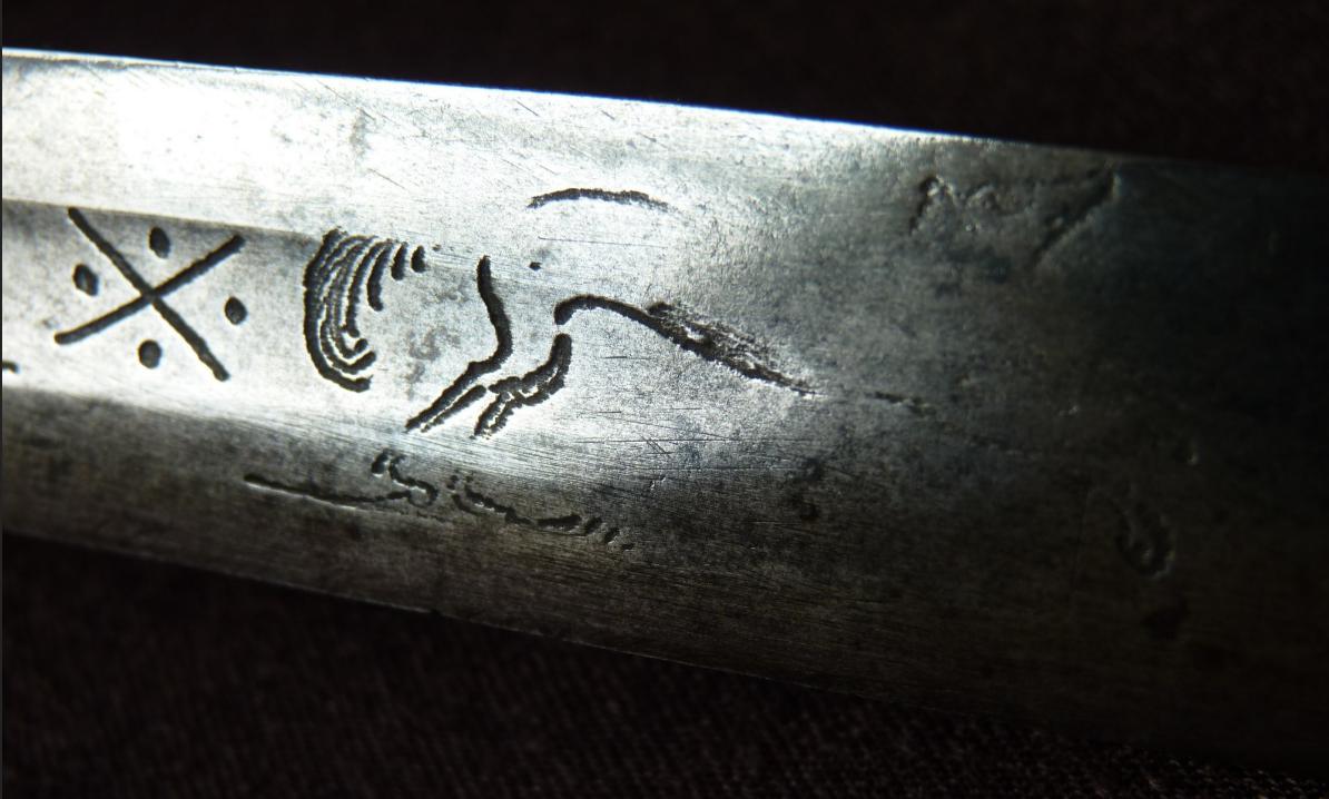 These seem to have been well known across Europe with the distribution of blades from Solingen with the crudely chopped running wolf, often applied with this magical number '1414' (and some variations). With the 'bushy tail fox', while of course not distinctly associated with the Passau wolf, the plausibility of imitation or similarly intended application cannot be discounted. The image of the BTF (as we call it) seems distinctly a fox in the STEYR (Austria) image (1620), with the striped bushy tail...which in my view is nothing like a wolf tail. The artistic style is very much in the character of the incised figures of stags and sometimes other animals in hunting sword themes (as noted by AHorsa). We have found that the BTF is a distinctly known image on some of the swords of Shotley Bridge (1680s-1700, and later) which seems in line with these markings attributed to Samuel Harvey c. 1750-80 in Birmingham. In the last image Keith posted, that curious X with dots device appears associated with occult/ alchemical symbols with that particular one aligned with 'caput mortem' (deaths head) which metaphorically relates to an alchemical process. Dots and lines in various characters also align with 'antler numbers' which were arcane symbols used in Austrian regions. This seems to fall in place with the Austrian 'fox' or wolf accompanying it. I think it is important to remember that these kinds of markings, symbols, devices and conventions were not distinctly aligned with a particular maker, and apparently not confined necessarily to certain centers or regions, nor periods. Clearly these became traditionally carried forth by later makers. |