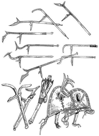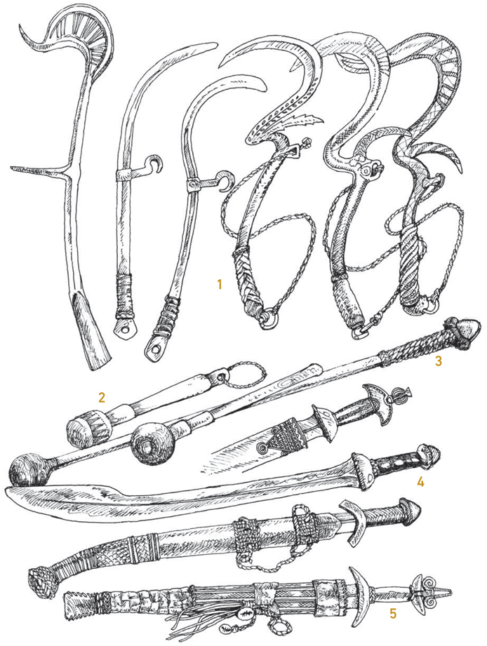 1. Mountain people's weapons 2. Throwing knives (musei, marba, lele, ngambay) with decorated sheaths. |