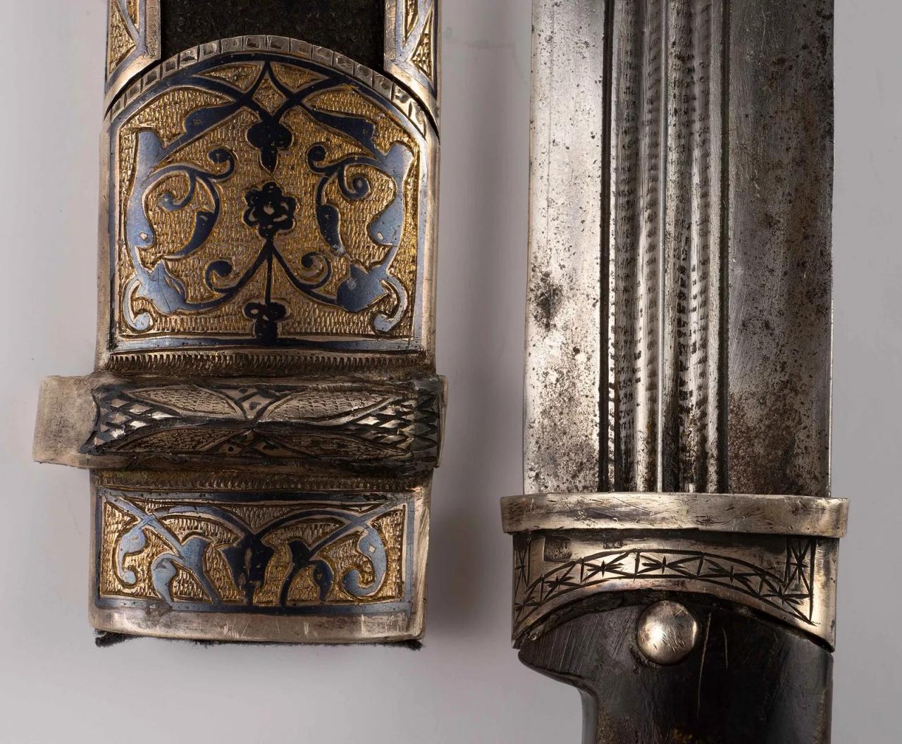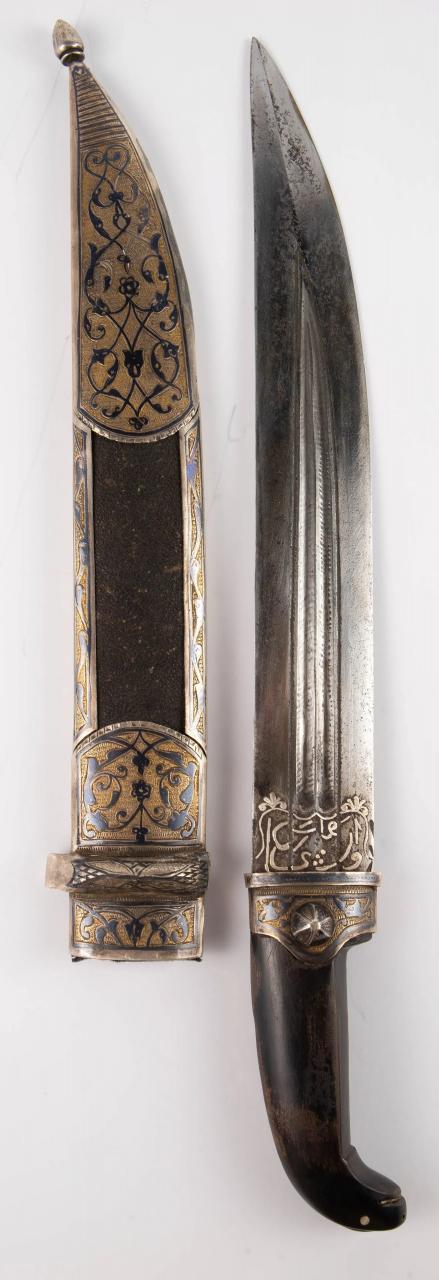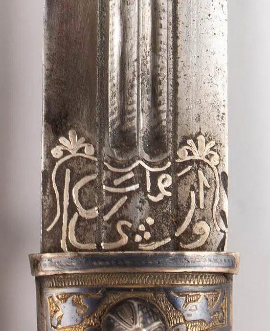 I have this Kinjal (Bebut dagger?). In my collection. Interesting looking hilt. Hilt represents an animal. There are three Russian proofmarks on the blade and the date '1891' so I know the Kinjal was made around that time (most likely in Dagestan or maybe Tiflis, Georgia?). But it's the etching on the blade I'm having a difficult time translating (Persian Arabic calligraphy? Thuluth of Naskh script?). I entered the script through AI translation and I got: Work of Ahmad and "O Allah". I've read that Praises/invocations from the Koran/hadiths are pretty common for these types of weapons. What do you guys think? Ideas?