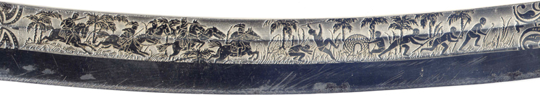 Here's something different. The sword is Ethiopian, as per Menelik's portrait, Lion of Judah, Amharic writing, the works, (thanks, Gennady), SO what the heck is this supposed to be???? The blade is very nice and clean, hetched and plated. I believe it is British. Don't ask me why; just a feeling. On one side, it has this scene, instead of the usual quotation from the Bible in Ge'ez. What do you see??? I see two scenarios: 1) some Amhara horsemen involved in a punishing party against an unruly tribe. 2) Arabic slavetraders raiding a village. I LOVE this puzzle. I did not know this was there when I bought the sword.... Have any of you guys seen anything like this?