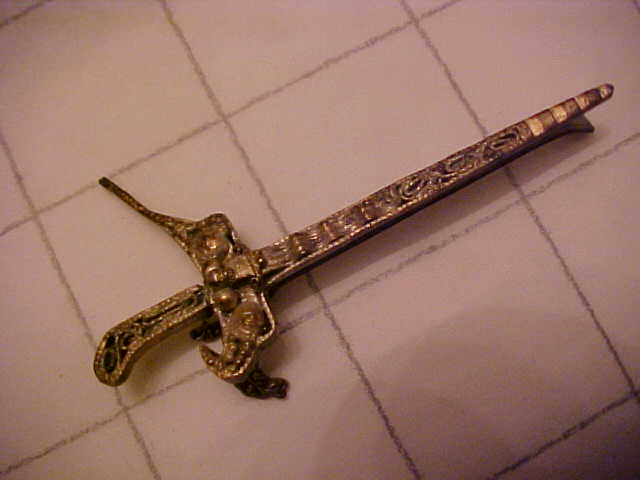The first is a silver(.900)keris pin that has some pretty amazing detail considering it is barely more than 2"(50mm)long.Sorry for the lousy pics but my camera doesn't do closeups very well. Strangely enough the detail work in the handle and scabbard is very reminiscent of a cross I bought that was made in Mexico.