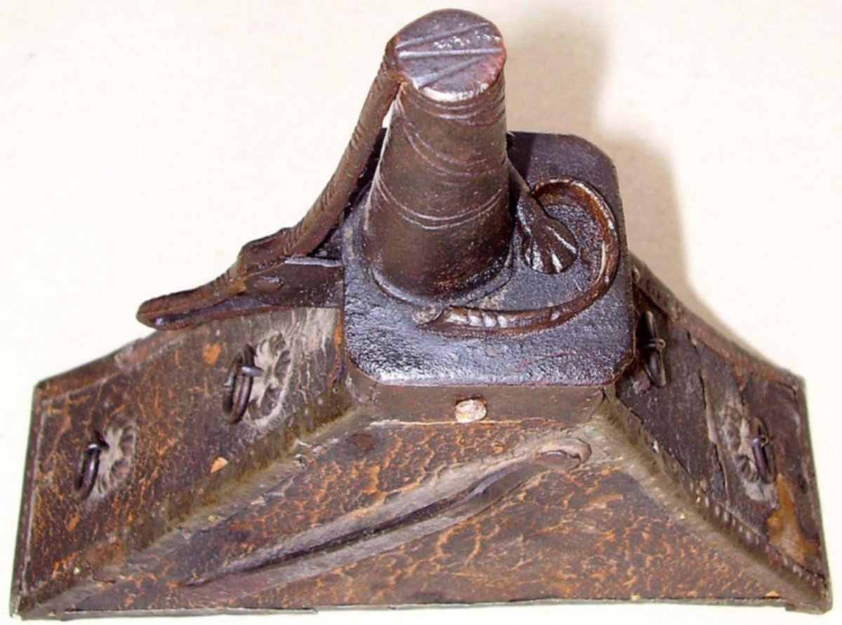 The wavy ornament seen at the lower edge of the basal iron mount is a typical Early Renaissance stylistic element that also occurs on ca. 1530's to 1540 guns and other ironwork. This ornament is also present on the rear end of the limewood stock and the muzzle of my fine Nuremberg Landsknecht arquebus, dated 1539, as well as on its counterpart in the Germanisches Nationalmuseum Nürnberg: