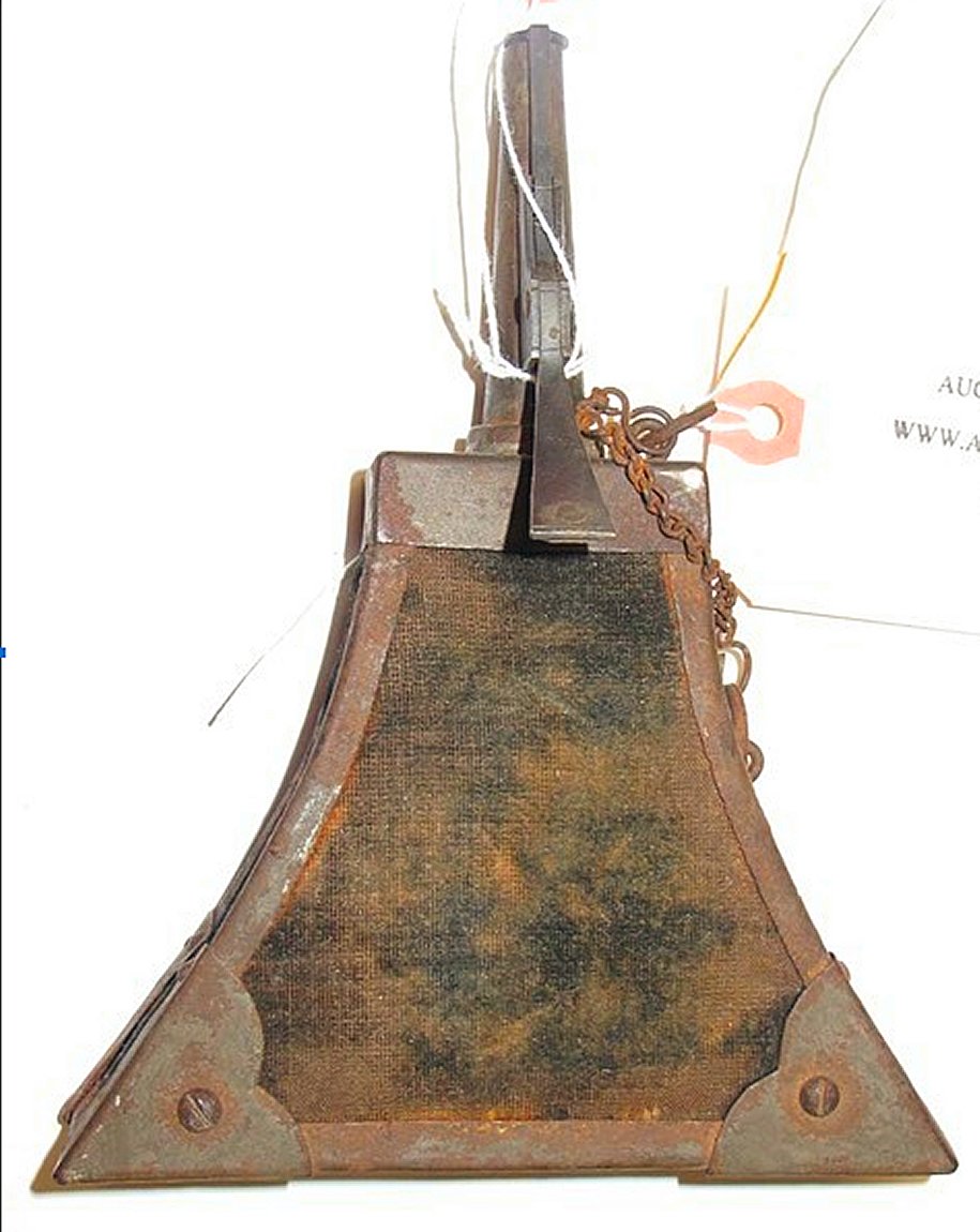 An Austrian musketeer's flask, wooden body covered with leather and mounted with iron fittings, late 16th/early 17th c., damaged but in virtually 'untouched! condition.