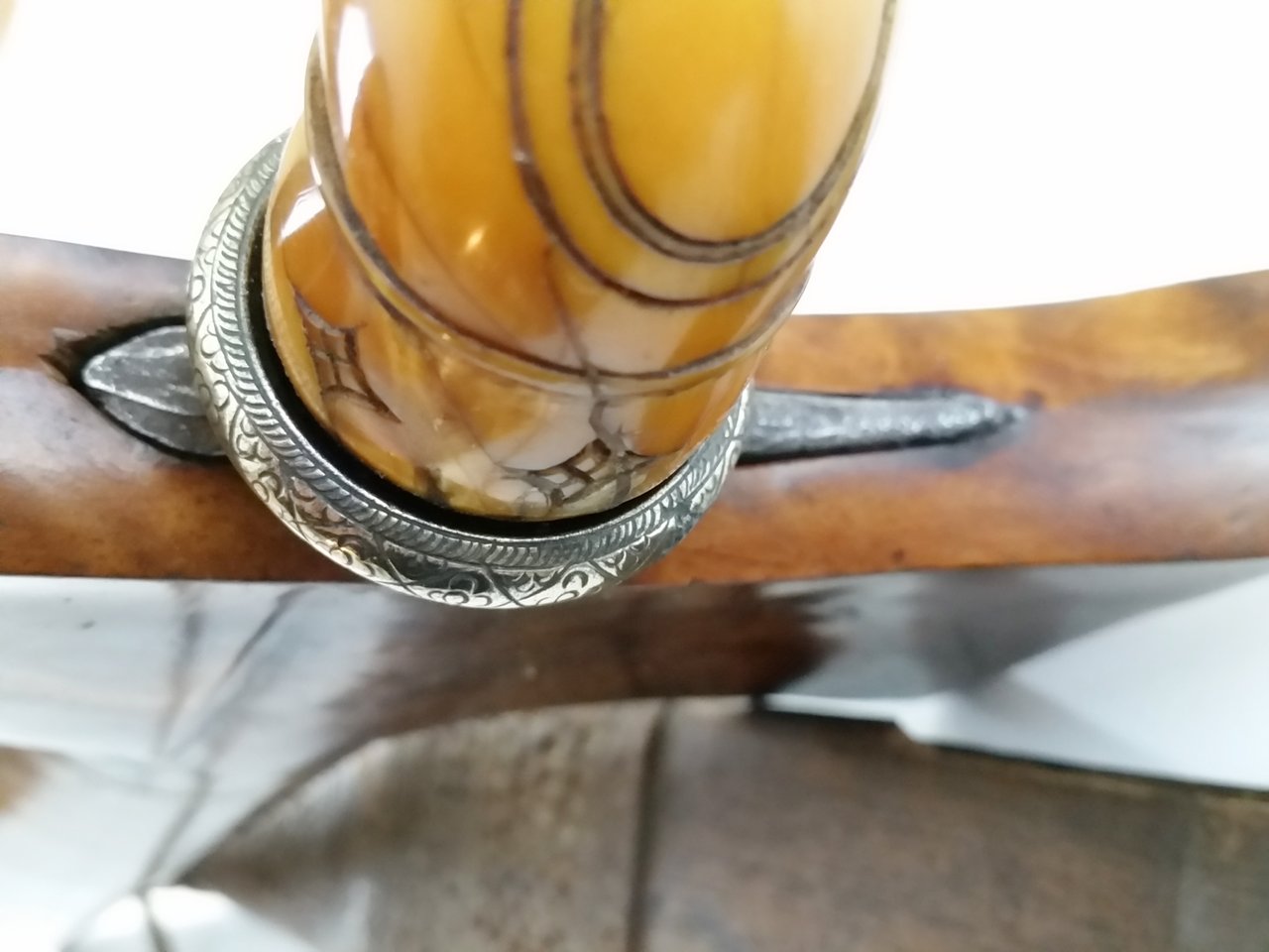 Very nice and rare ivory hilt, the scabbard does not look very old but I could be wrong (check inside the slot), the blade with strong gusen (bevels) on the edges has an odd ganja (iras?) but which seems original. From the pics the selut seems to be from brass but again I can be mistaken. A very good kris anyway, congratulations!