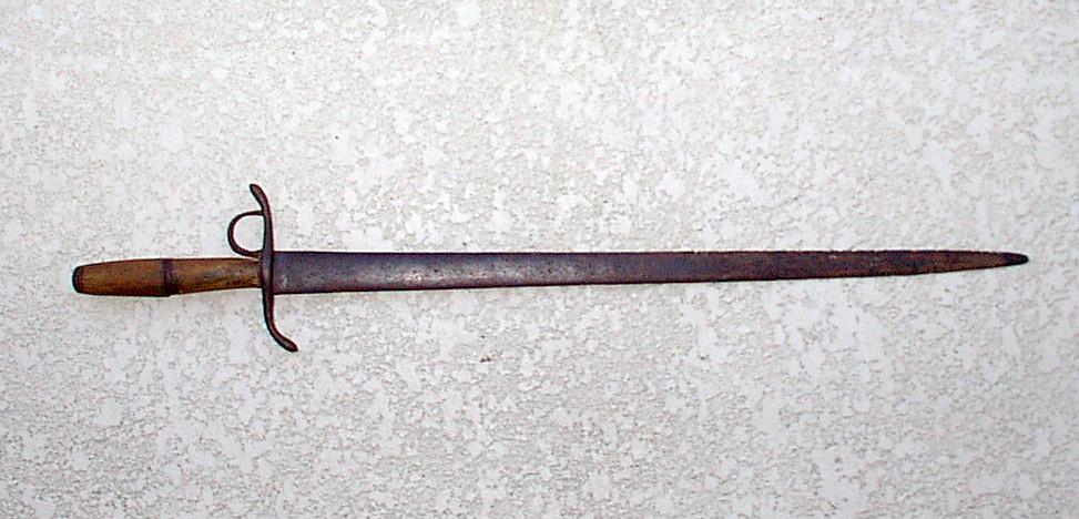 This was a great thread from 2008, although it digressed a great deal into terminology and intriguing, but heavy discourse regarding gauchos etc. which I hope will not be the case here. In looking at the form of the hilt, it recalls the Spanish colonial hangers (pre Mexican independence of 1821) which are termed 'round tang espadas' (Adams '85). These have the same kind of wood or horn grips in this shape with often brass spacers between. This is a feature of Spanish colonial hilts that seems to have prevailed throughout the Spanish trade empire clear to the Philippines and into the 20th century. I would say your first example that began the thread is the most recent, probably turn of the century, and very well could be an Argentinian fabrication, with as noted, a British Martini Henry M1860 yataghan bayonet. The "Spanish Main" was of course well in place in these times still, and we have discussed often the many forms of edged weapons, often with maritime association that kept South America and all of Latin America well connected. The second example has the characteristic hilt sectioning, but has the distinct ring on the guard. The example in Levine seems to have a larger ring which is closed, while this is more of a curved quillon. This apparantly older example seems to exhibit an even rougher and key representation of this appendage, and this example reflects the earlier examples of this form and the familiar quillon terminal styling carried from even earlier Spanish colonial swords. I wanted to add one of the examples of yours which corresponds beautifully to this one. The Martini Henry bayonet 1860 attached is to correspond to the blade in example one. Very, very nice!!! |