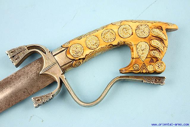 ![]() As an afternote I add that in Diverse arms Orientals plate 32 Butin there are several Horse heads with what could be called ears. In addition there was a sword of Tipu Sultan with similar hilt. See http://www.tessier-sarrou.com/html/f...rdre=&aff=5&r= and below The finial at the end of the knuckleguard on the Indian item ends in a bud whereas on the Zanzibari Ivory piece it is a geometric dragon with RR almost as a monogram with fowers and dots engraved. The Knuckleguard however follows the contours of the horses face in both. The quality of craftsmen in the Indian Ocean basin was excellent as seen by the Ivory carved hilt and by ivory combs executed in exacting detail. Thus the Indian version is viewed perhaps as a hybrid of top class artesanship in the general region. Last edited by Ibrahiim al Balooshi; 31st August 2017 at 06:59 PM. |