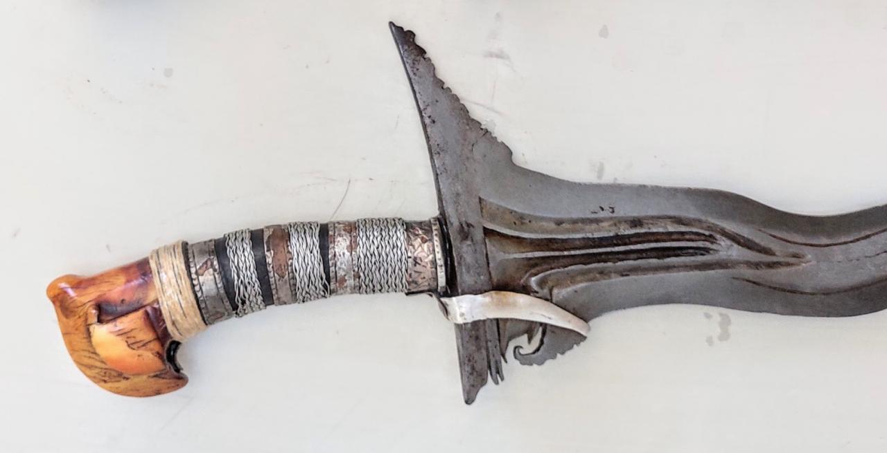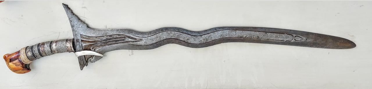 My notes on the matter: 1. The piece has 18.3in blade, measures 23.5in overall. 2. I removed the galgal near the tang (without meaning to reset) because the fragments were falling off. I decided to clear away all galgal near the blade base to secure the blade with easily-removable clear epoxy. It was an unexpected but fortunate surprise that I was able to see the upper part of the tang in the process. 3. Upon closer inspection, the asang-asang seemed to be retrofitted at a later date; the area under it did not have indentations for an asang at all, meaning the kris was built without an asang in mind. 4. The exposed tang is cylindrical, it had no angles (circular). Because of this feature, I believe (also based on the accumulated discussion in this thread andwith other collectors) is that this piece may be pre-1700 and fit into the "missing link" category. 5. The throat of the pommel was originally wrapped with torn copper wire; I removed it and replaced with hemp solidified by clear epoxy, to secure the pommel part. 6. I'm well aware that my aggressive restoration has reduced the value of the piece; however I've always been of the thought of striking a balance between a piece's provenance and future-proofing it. I know it's not everyone's cup of tea (especially of museums/provenance-particular collectors), but it is what it is. This piece is my lineage's pusaka already after all. 7. I'm attaching a comparative picture with 2 other pieces- a 23-in blade late 1800s kalis, and another archaic kris with 19.2in blade, which I think is late 1700s or early 1800s. Last edited by xasterix; 29th May 2022 at 05:07 AM. |