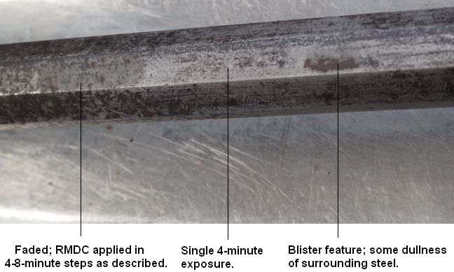 Using RMDC demands a heck of a lot of attention - in stark contrast to the glib promises on the bottle, one is not "freed" from the process, simply because (unless one knows precisely what metal one is working with) one has to keep checking on the effect it's having on the object upon which it is used. This is especially so in this case, because of the importance of preserving the pattern on the barrel.