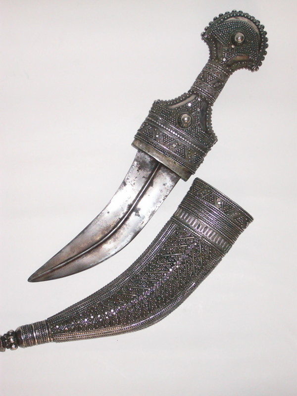 ). From what i learned here: http://www.vikingsword.com/vb/showthread.php?t=13214 This type of jambiya is called thuma and worn mosty by scholars and judges. Hilt and sheat are most likely of german silver. The decorations are made from wire and then soldered to the surface. The blade has a triangular spine and appears to be massive. I don't see any traces that indicate it has been welded together. What puzzles me are the marks on the back of the hilt. It doesn't look like language. I was hoping someone here has an idea about what these could mean/represent. Best Regards, Thilo |
