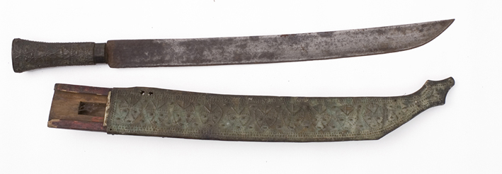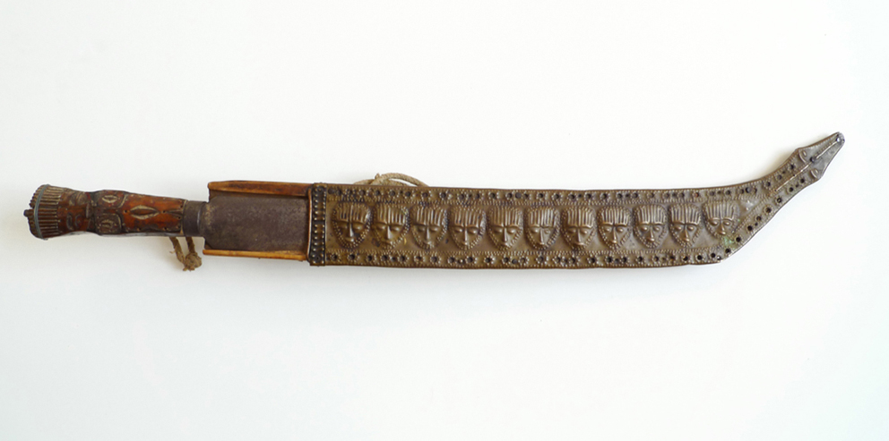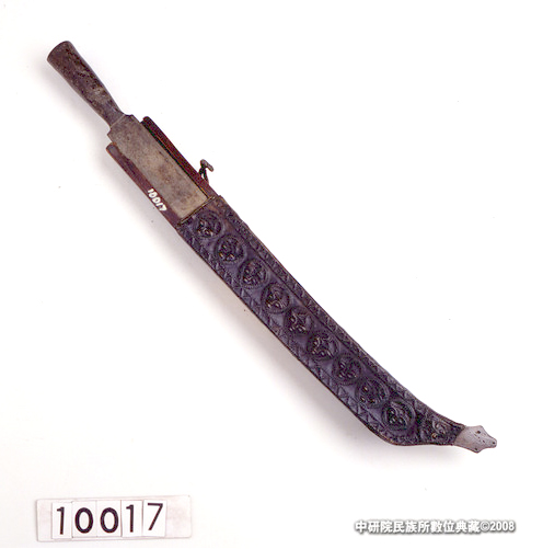 I am pleased to show the last Paiwan knife I purchased. The metal work on the sheath is different from the two others I own and I enjoy these different ways to represent the heads they valued as they were head-hunters. Most sheath are carved but some have the blade covered by a stamped foil of metal.