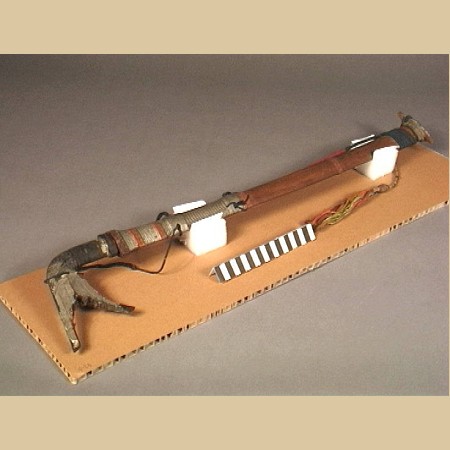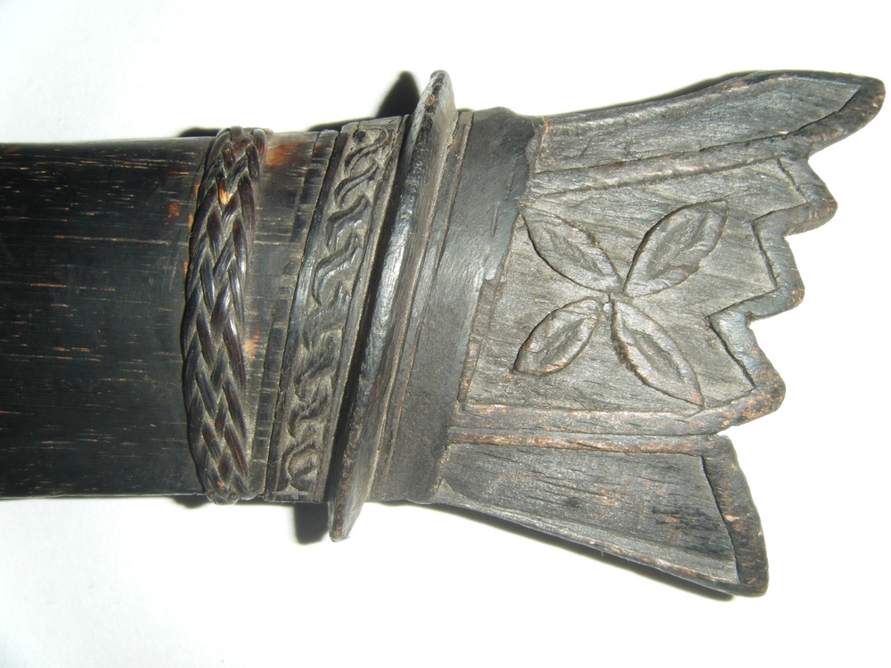 since never before at this place was shown a Sumara I want to share my one with you because I think that this are very beautiful and unusual swords. The very nice and fine carved handle is set together from two pieces of horn. At the scabbard which is also from two pieces of wood held together by finely wooven rotan (?) bands you will find as well some nice carvings. The end piece of the sheath is a later replacement and not the original one. The sword in scabbard is 81 cm long and the blade is 47 cm. Hope to see some other nice examples. Regards, Detlef Last edited by Sajen; 20th February 2012 at 05:22 PM. |
