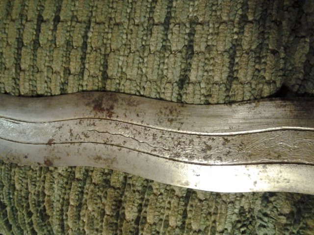 Ok guys been working a while on this now. ive still got a little bit of deep rust but veey afrqid it might get rid of the etching on the twist core. i noticed i only put one side of blade on here so here is orher side. yes it is cracked on the twist core. from what my grandfather has told me his father actually used it in battle and it came from that. is that a good possibility? looks like it got struck in that area. but i also got all rust off the spear. here are a couple close-ups on that. i myself cant see a twistcore yet. and ps. getting a family members journal or copy there of is almost impossible with the state of ks. but keep trying. what do people think so far on the blades?