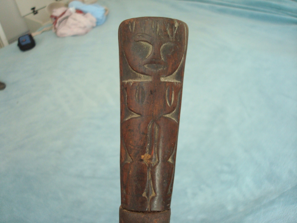 Here is the second of three examples. What I find interesting about all 3 is that while they have some similiarities, they all have differences. All three have different forms of ancestors and different types of scabbard decoration. If all 3 are Paiwanese, does this suggest that these pieces took on a very personal design and that is why you find this kind of variety or are we looking at pieces from different tribes?
