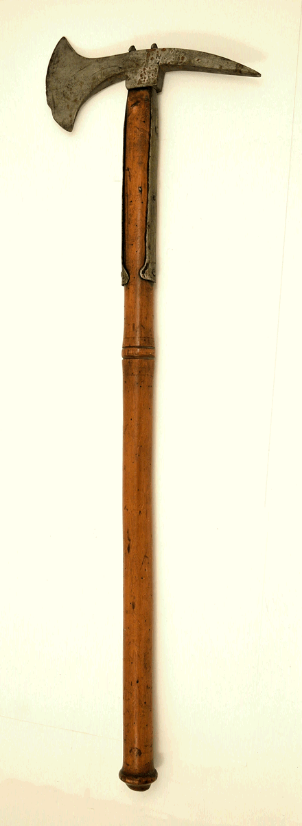1) British, perhaps early part of the 19th century. It is heavily pitted and no markings remain but even with the pitting the axe is very heavy and substantial. As an indication of this the metal thickness at the base of the spike is slightly over ½” (15mm) thick. The head rivets indicate that it has been re-hafted at some point and I wonder if the haft was increased in length as it is a full 4 ft. (1.2m) long. With the long shaft it is well balanced but I think too heavy to be wielded quickly as an effective weapon.