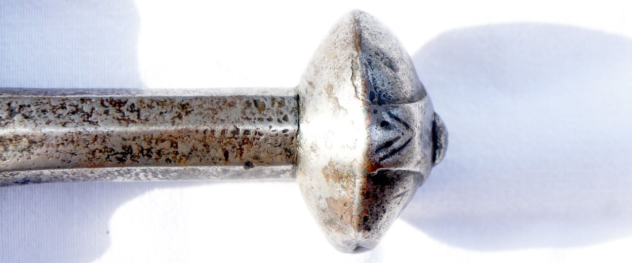 The blade on this one is a rather poor local one. Not a particularly convincing combat weapon, but the hilt is very nice. The grip is unusually a wood core and the pommel is exceptionally large.