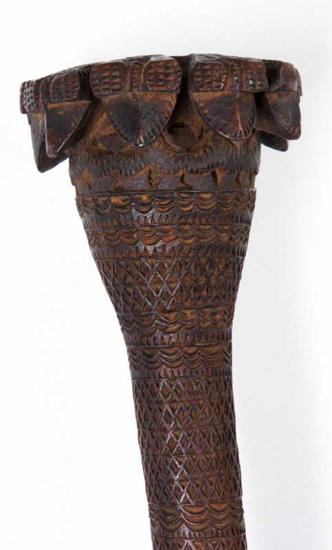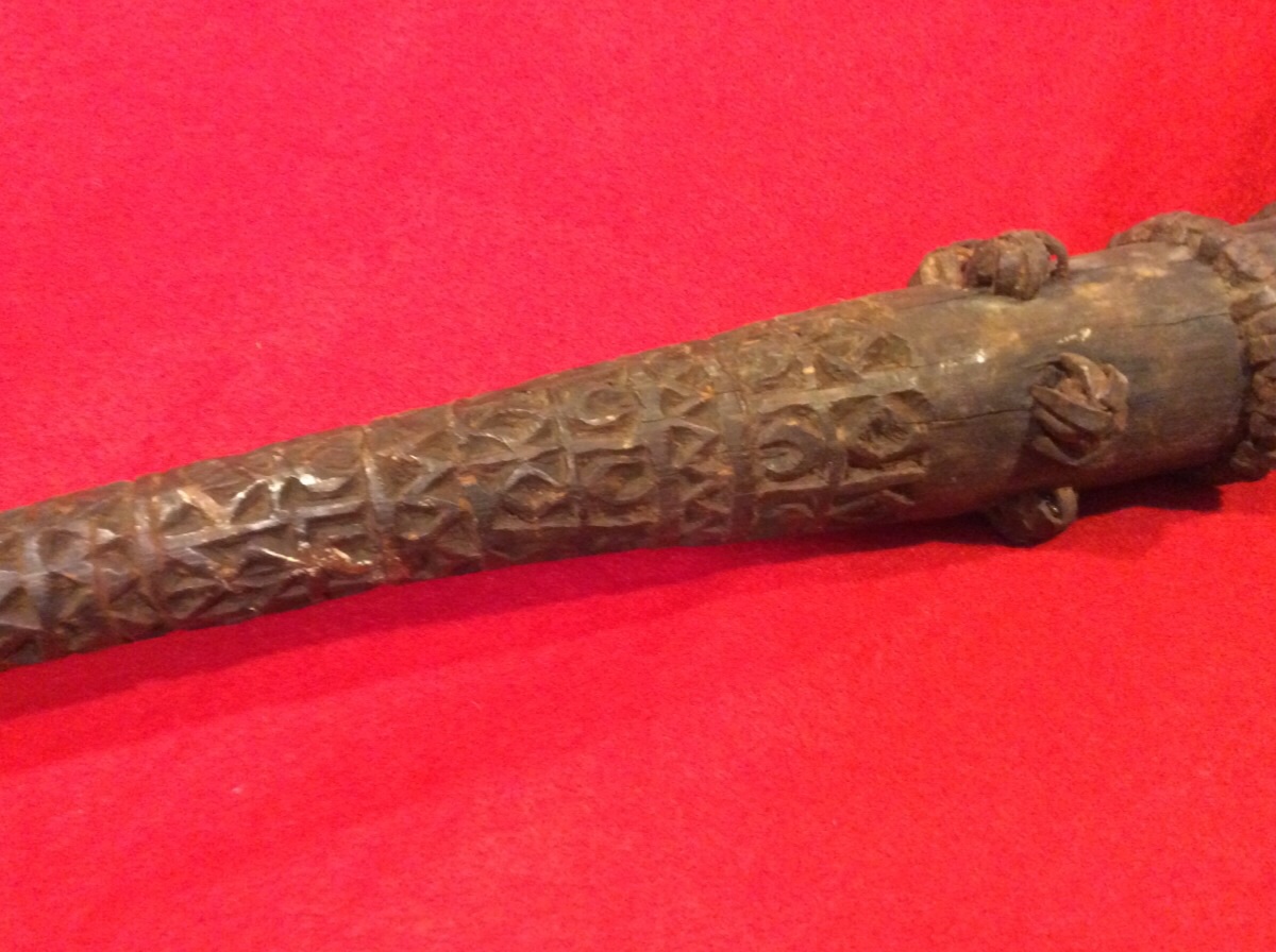 THE CARVING LOOKS LIKE THAT USED IN THE SOUTH PACIFIC IN FIJI AMONG OTHER PLACES. THE COWRIE SHELLS AND NAILS SHOWED WEALTH AND SERVED AS MONEY. A LOCAL RETURNING TO HIS VILLAGE WITH SUCH A CLUB WOULD IMPRESS AND SHOW HIS SUCCESS AND WEALTH.