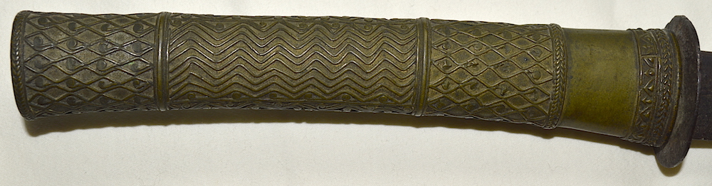 It has a brass hilt of elliptical cross section and a small guard. The hilt reminds me somewhat of the Japanese-influenced Thai daab from the Rattanikosin period in the mid-19th C. There are a number of high end daab in the National Museum in Bangkok that show this style of hilt in gold (some examples are shown in this link http://www.vikingsword.com/ubb/Forum1/HTML/002442.html). However, I'm not entirely happy with that designation. The sword definitely has some age and might well be 150 years old. I'm not inclined to damage the patina on the blade or hilt at this time just to see what's underneath. Thoughts about where this one may be from would be welcomed. I have my suspicions, and have talked with fellow forumite Nathan off line and he has some thoughts too. But I would like to hear from other dhafia as to where they think this one may be from. Ian. Last edited by Ian; 11th July 2015 at 06:50 PM. |