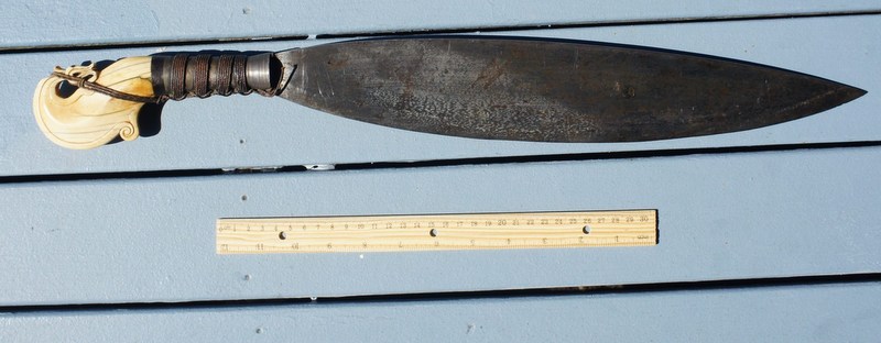 I've just won this ivory-hilted barong sword from a local auction site here in New Zealand. It was described by the seller as a bring back sword from Malaya/Borneo by a NZ officer and dates from the 19th century. The ivory hilt has a horn spacer after the silver ferrule with twine wrapping for easy grip. The hilt is carved in the form of a stylised dragon head or naga which I think is rather quite rare. The blade looks like a typical single-edged barong blade with probable lamination patterns. The pictures are from the seller. Cheers, Algelan Last edited by Aslan Paladin; 17th January 2016 at 05:11 AM. |