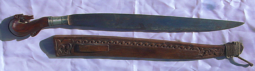 MY EXAMPLE IS A BARONG BUT IT HAS A MUCH LONGER THINNER BLADE THAN THE OTHERS PICTURED HERE. IT IS 27.25 IN LONG IN SCABBARD WITH A BLADE 18.75 IN. LONG BY 1 AND FIVE EIGHTS INCHES WIDE. I HAVE HAD IT SINCE 2006 IT DOES HAVE WEAR AND PATINA AND PERHAPS A WATERED STEEL BLADE BUT NOT OBVIOUSLY SO. THERE IS IVORY INSET FOR THE EYES AND ALONG THE BACK OF THE NAGA'S NECK. SILVER FERRULE WITH DESIGNS AND CARVED DESIGNS ON THE SCABBARD. IT WAS SAID TO BE MORO COMING FROM THE SULU AREA MINDANAO ISLAND. BANTI WOOD HANDLE AND OKIER CARVED DESIGN ON FERRULE AND SCABBARD. SORRY FOR THE PICTURE QUALITY, SHADOWS AND COLOR BEING OFF A BIT BUT ITS THE BEST I COULD DO.